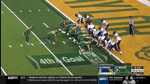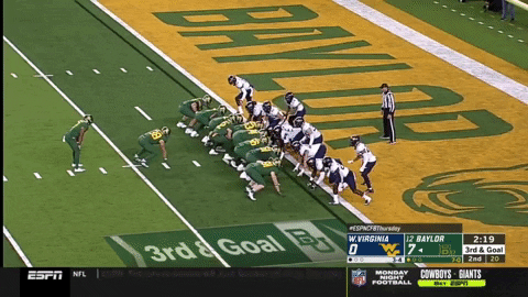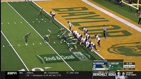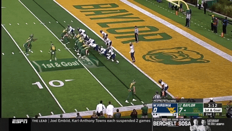 Two drives later, Baylor went 82 yards on eight plays to set up a first-and-goal at the three-yard line. If Baylor was able to score a touchdown here and go up 14-0 ahead of halftime, that might have been the dagger for how poorly WVU’s offense was playing to that point. To stop them, WVU’s defense would need to stop the Bears on at least three plays with less than five yards to go.
