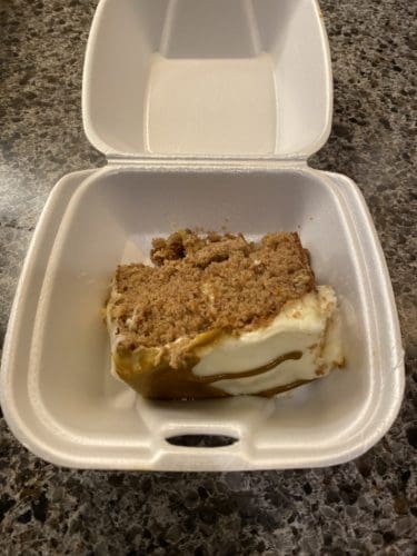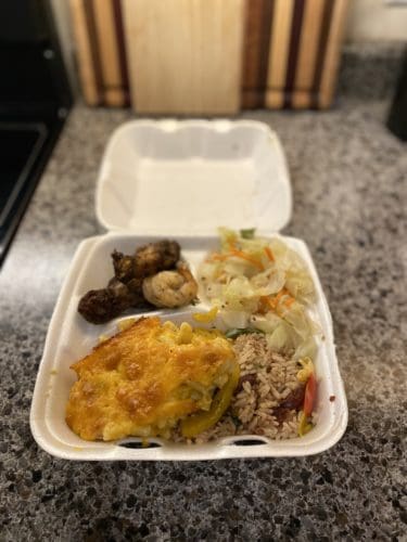 I reached out to Paulicap on Thursday, ordering a medium plate and a dessert. Thursday’s meal included jerk chicken wings and jerk shrimp as the entree. The sides are mac and cheese, steamed cabbage, and rice and peas. The dessert for the night was a piece of carrot cake. Paulicap himself delivered the food with a charge of $3.