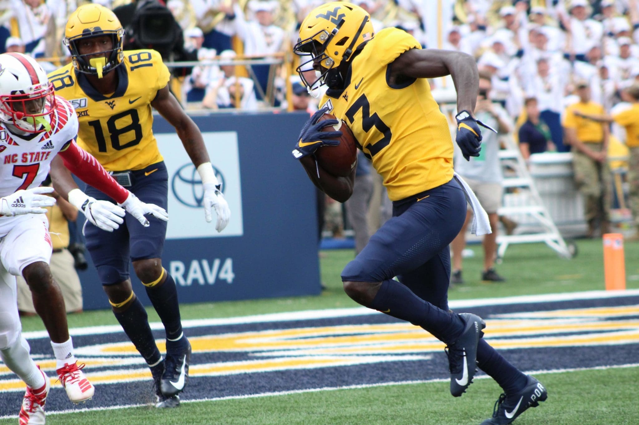With very little decided at the receiver position coming into the season, young players like James have been relied upon to make plays in the first three games and did he ever make plays this afternoon. The connection between the redshirt freshman and quarterback Austin Kendall was evident early and seemed to breathe life into an offense that had looked stagnant through two weeks of play. On the Mountaineers’ first offensive possession, a pair of big plays from Sean Ryan and true freshman Winston Wright set WVU up on the Wolfpack 20-yard line. A tunnel screen would be set up for James and the speedy receiver was able to make something happen, avoiding multiple tacklers over the middle as he traversed the field and broke a tackle at the goal line to give his team a seven-point lead to start the game.